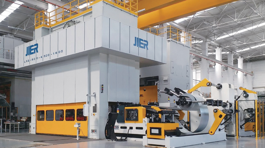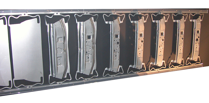 多工位、级进模线适用于汽车、农机、轴承、电机、电器、轻工、纺织机械等各工业部门。这种压力机在一次工作行程中可完成多道工序,如落料、冲孔、拉伸、弯曲、切割、校正等, 是一种高效率压力机;与普通压力机相比,多工位压力机具有能自动上下料、材料利用率高、能源消耗低、生产效率高、压力机占地面积小、生产成本低等优点,对大批量生产非常适用。