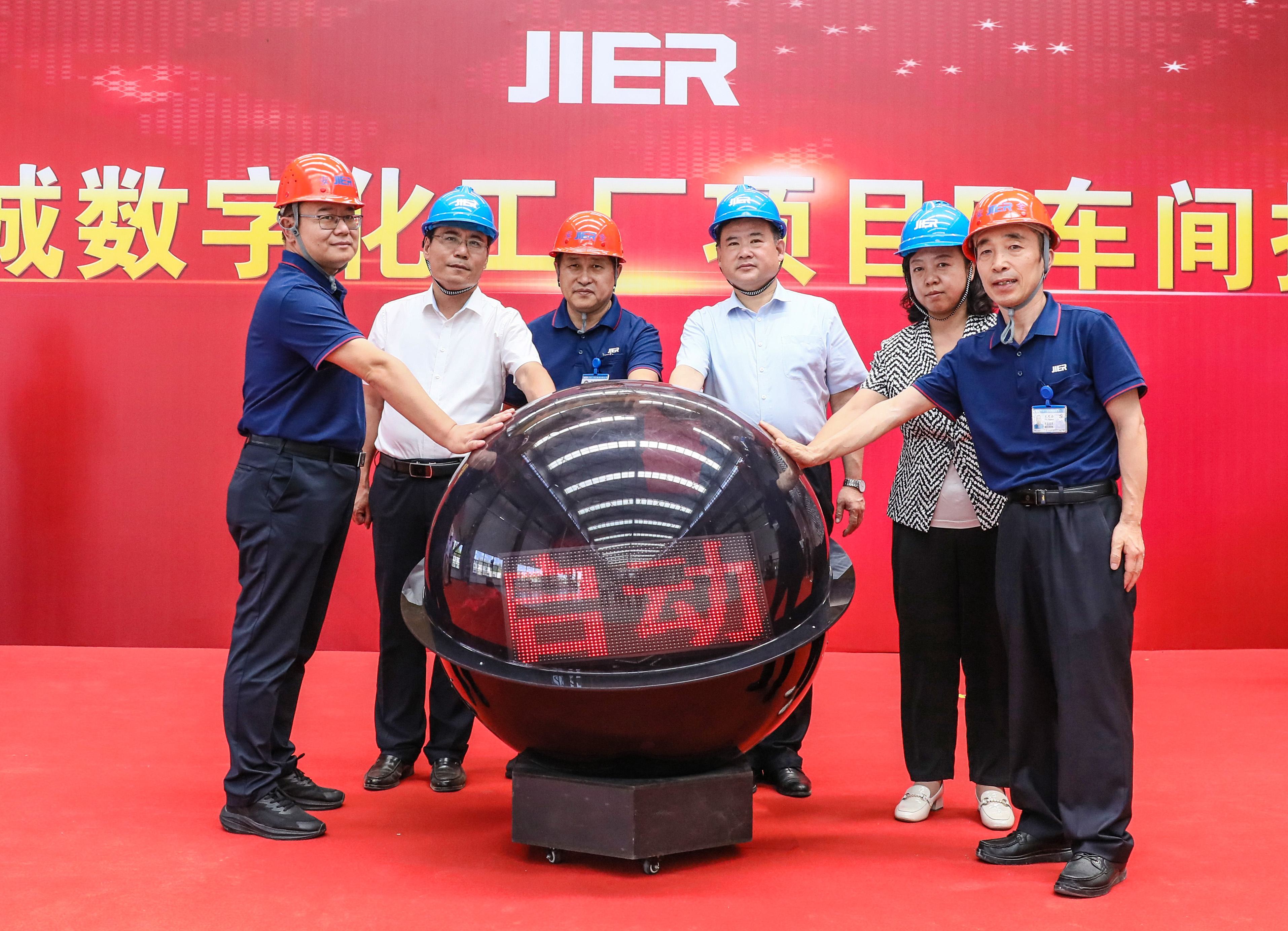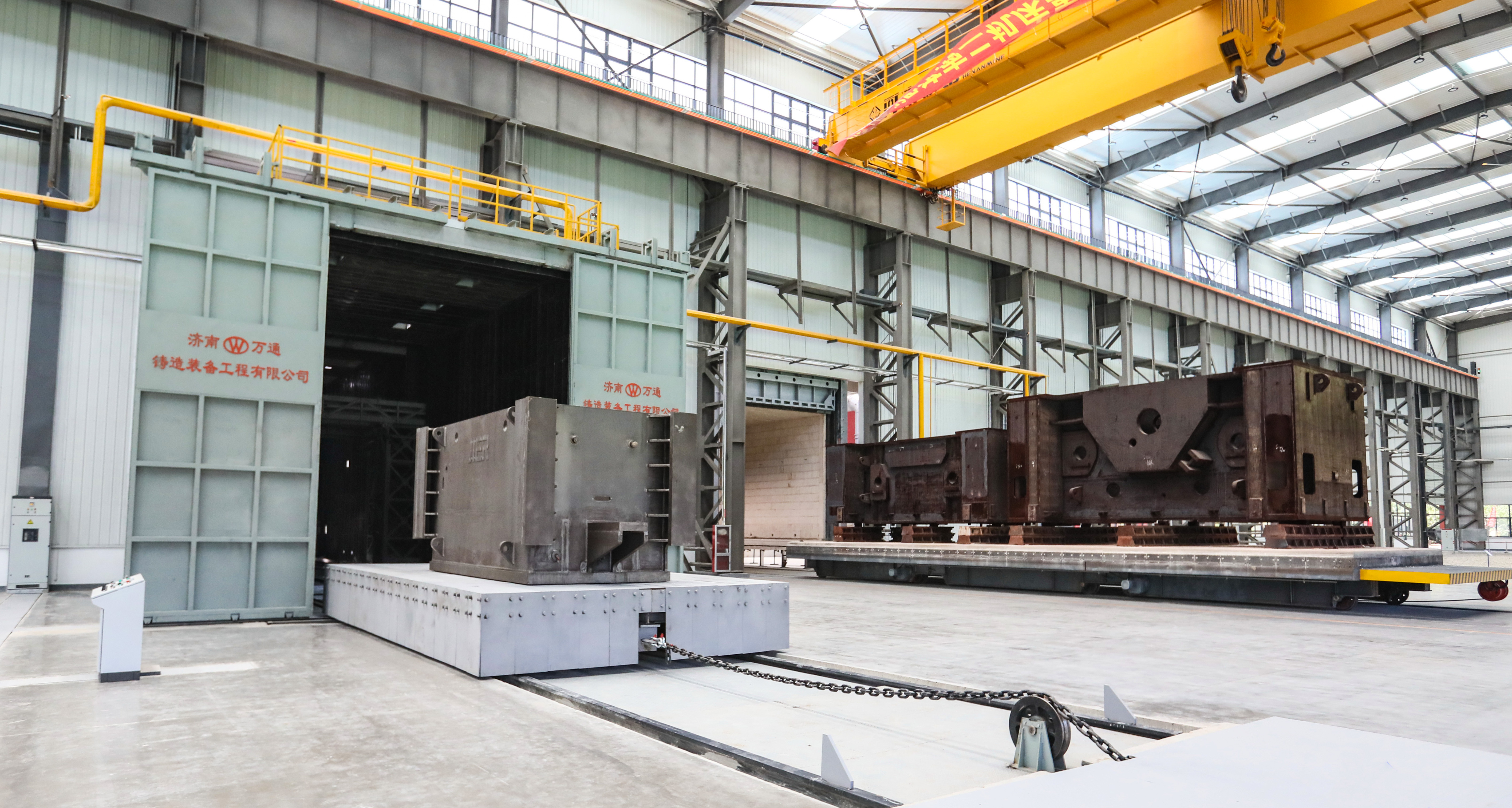 最后,参加仪式的领导共同点亮启动球。承载着第一批完工零件的台车从抛丸室和时效炉中缓缓开出,标志着E车间正式投产。